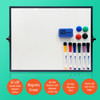 • (6) dry erase markers with magnetic eraser caps in Red, Blue, Light Purple, Orange, Green, and Black