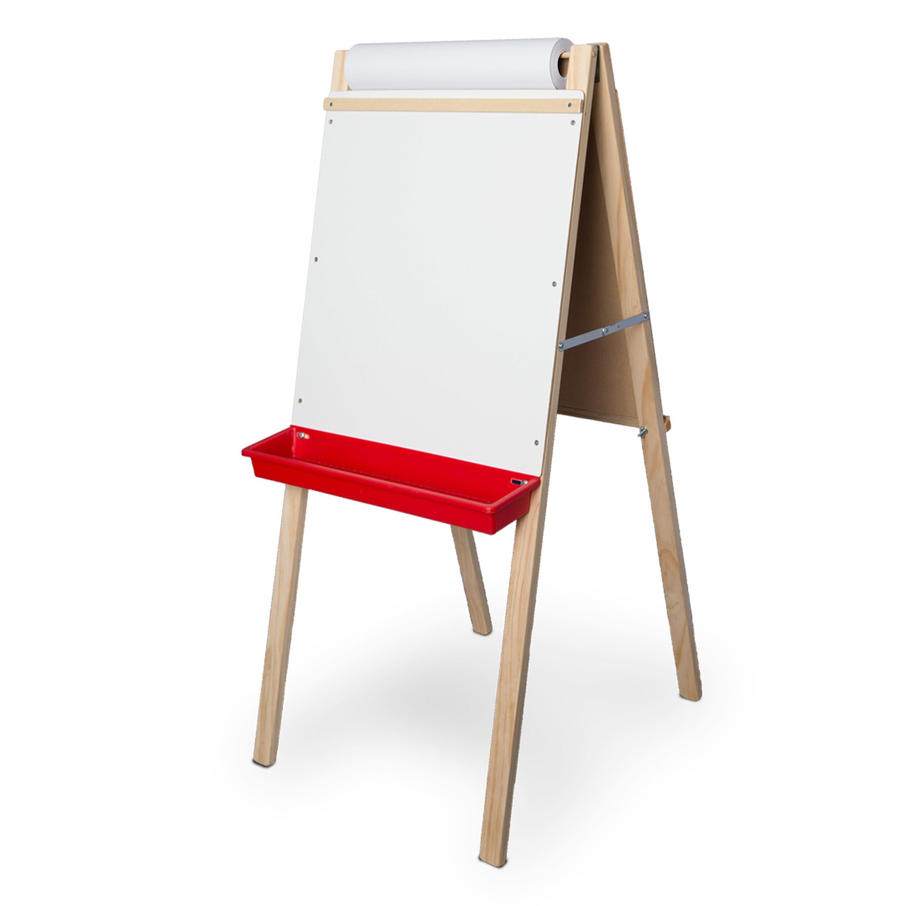 - Lead-free chalkboard on one side, a white dry-erase board on the reverse, and a paper roll on the top.
