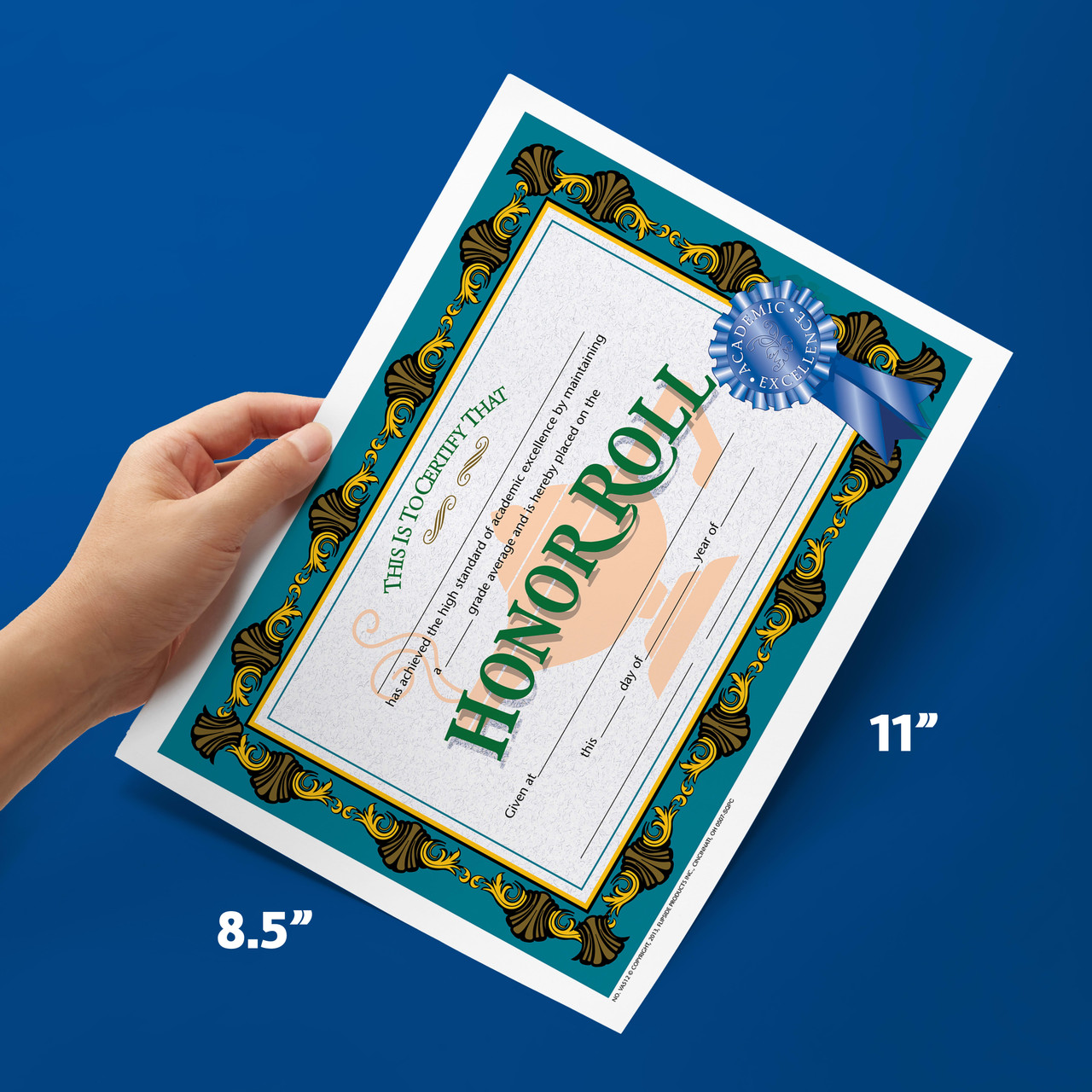 Honor Roll Certificates recognize students who have attained academic excellence, serving as tokens of their hard work and dedication. Perfect for end-of-year celebrations or award ceremonies, these Hayes certificates feature captivating designs and are printed in full color on high-quality matte paper, adding an elegant touch to any recognition event. Whether customized by hand or using a downloadable template, each certificate ensures that every achievement is commemorated with distinction. Each pack contains 30 certificates, measuring 8.5" x 11", ensuring an ample supply to honor deserving students throughout the academic year. 30 certificates total.