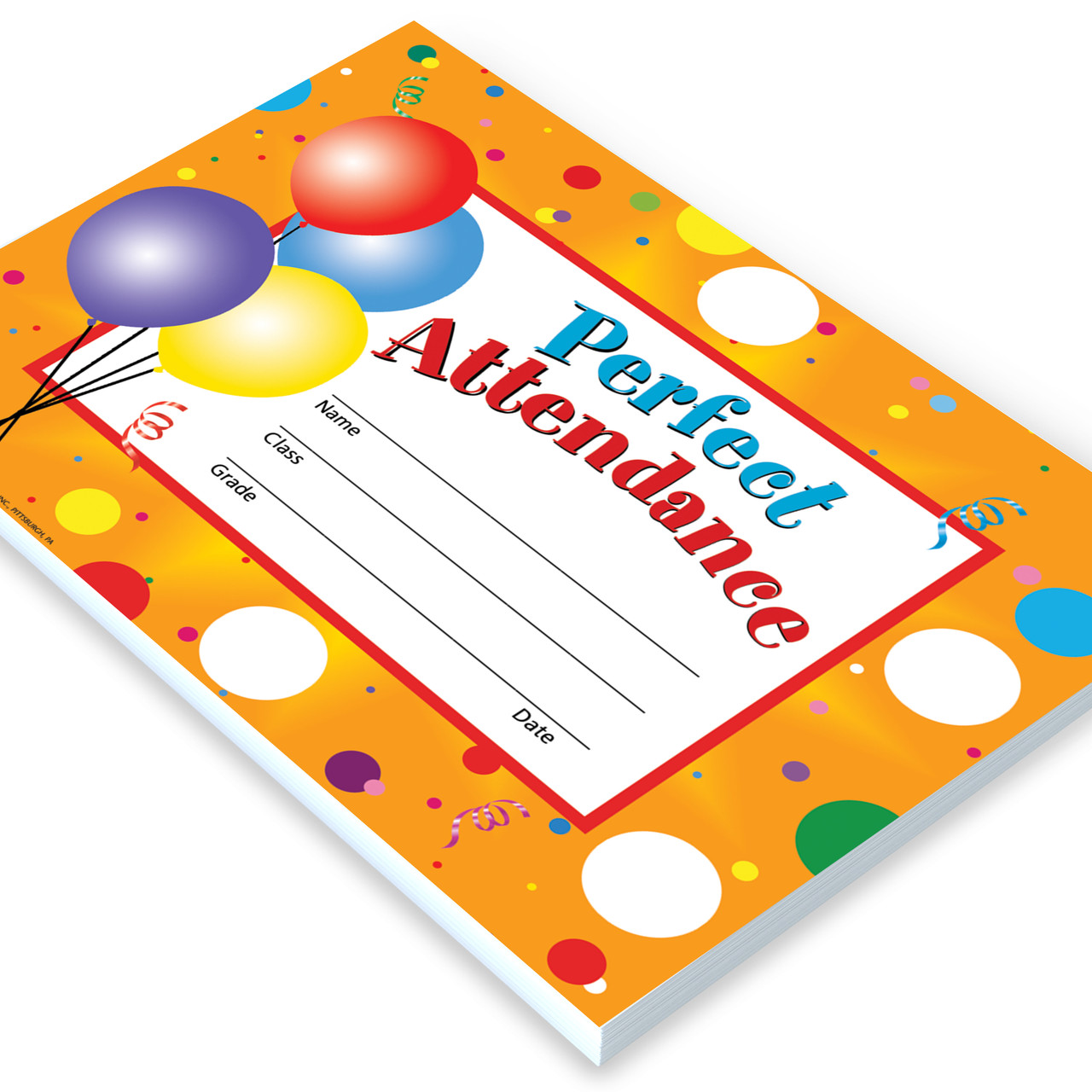 - Certificates feature a festive orange background with white polka dots, colorful balloons, and ample space to personalize with the student's name, class, grade, and date.