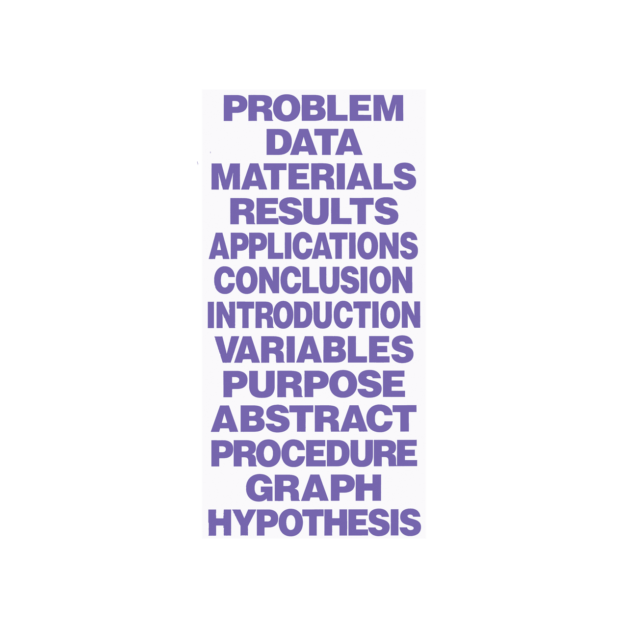 Science Fair Titles add a pop to displays and will wow teachers and judges! Printed in bold purple, all capital letters on white cardstock, titles complement our project boards to keep displays organized and complete. Each set includes the following 13 titles; Introduction, Procedure, Hypothesis, Problem, Data, Materials, Variables, Results, Application, Conclusion, Graph, Abstract and Purpose.